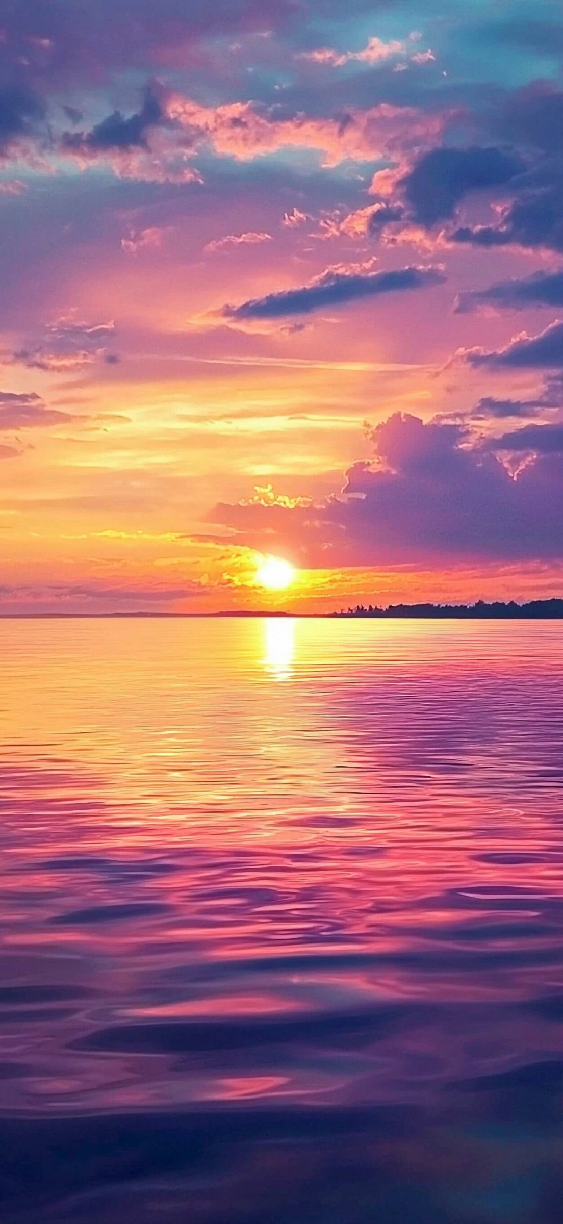 Sunset over water aesthetic wallpaper with vibrant orange, pink, and purple reflections